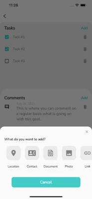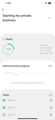 - All data are stored locally on your mobile. - Flexible notification system, you specify. - Breaking your goals into small tasks for easy tracking. - Support your goal and attach locations, contacts, documents and URLs. - Multi languages.