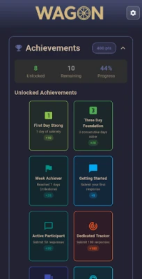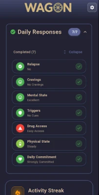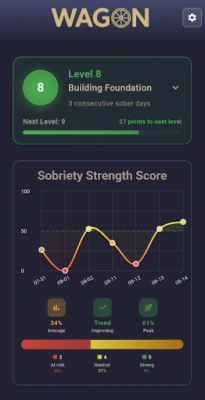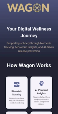 Wagon is a digital wellness platform designed to support individuals on their sobriety journey through biometric tracking, behavioral insights, and AI-driven relapse prediction with a sobriety strength score.